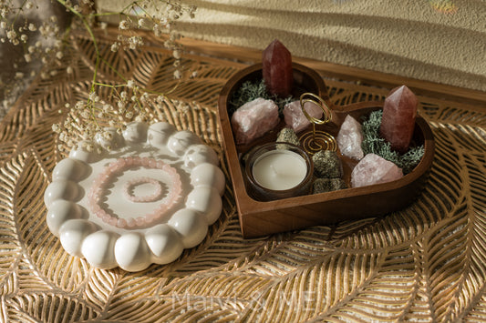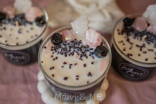 Duftkerze mit Heilsteinen (Rosenquarz, Granat)