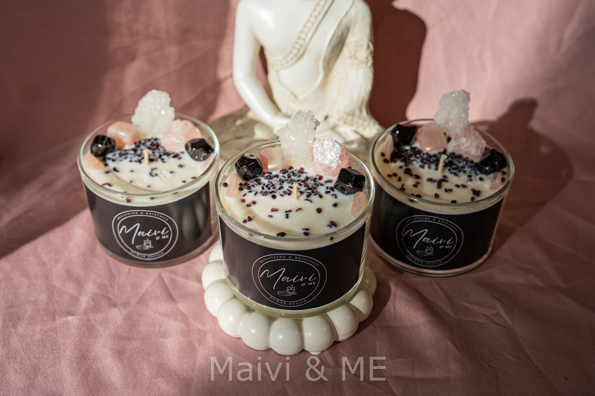 Duftkerze mit Heilsteinen (Rosenquarz, Granat)